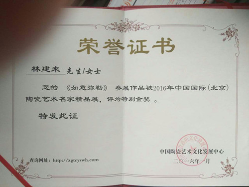 林建来 :福建省工艺美术师,德化陶艺柴烧协会副会长,1974年出生于中国瓷都德化,师从福建省工艺美术大师,20多年专业从事陶瓷雕塑创作,2005年成立建美陶瓷研究所,擅长于传统观音,佛像创作,并对柴烧工艺颇有研究,2007年7月作品《吉祥如意》荣获中国工艺美术古典家具金奖。2012年7月作品《盛世煌鼎》荣获中国工艺美术古典家具金奖。2012年10月作品《鸿运当头》荣获福建省旅游纪念优秀奖。2015年11月《禅器》荣获第十四届亚洲艺术节德化陶瓷艺术交流展一等奖。在第十四届亚州艺术节第二届海上丝绸之路国际艺术节一世界瓷都德化陶瓷(柴烧)艺术交流展中<禅器>获(一等奖),中国国际<北京>陶瓷艺术名家精品展<如意弥勒>金奖。2016年经中国陶瓷艺术文化发展中心评审委员会评定为“中国陶瓷艺术家”。