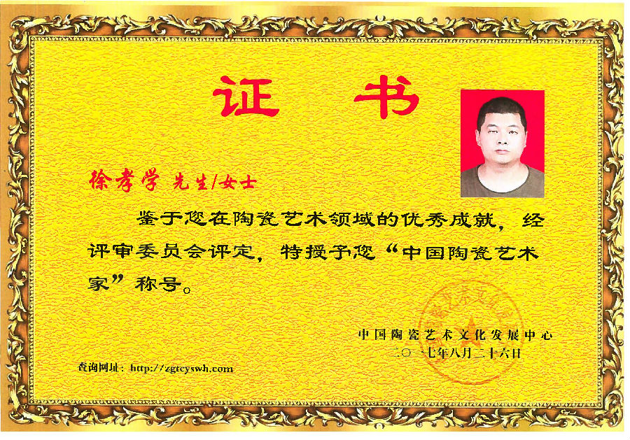 2017年经中国陶瓷艺术文化发展中心专家评审委评定为“中国陶瓷艺术家”!