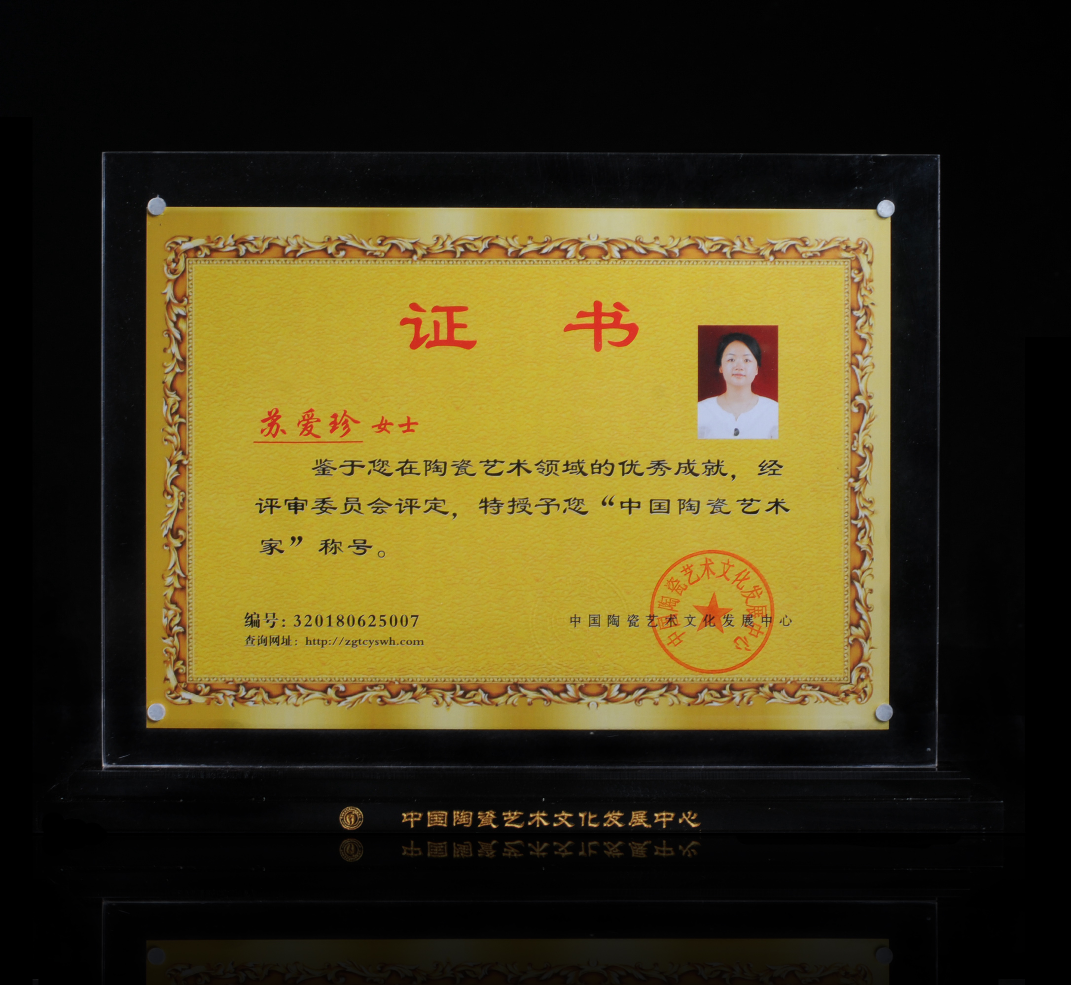 苏爱珍,1985年出生于世界陶瓷之都德化,毕业于泉州市工艺美术学院,中国陶瓷艺术名家、中国陶瓷艺术非遗传承人、高级工艺美术大师、优秀创作坊工作室、中国陶瓷艺术文化发展中心会员、“月陶堂”艺术总监。