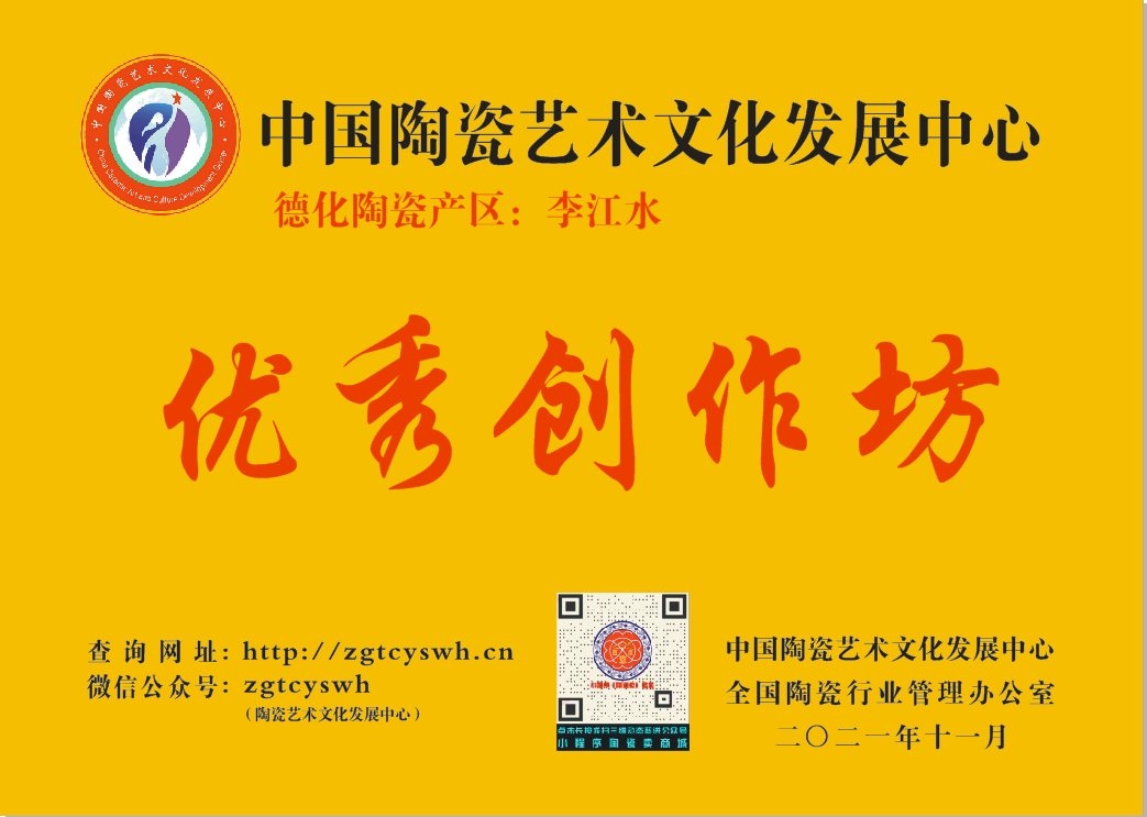 李江水,男,1973出生于“世界瓷都德化”,结业于德化陶瓷学院美术系专修班;中国陶瓷艺术名家、中国陶瓷艺术文化发展中心会员,李江水从小就酷爱陶瓷创作,毕业后开始了陶瓷艺术之路,研究泥巴,釉水,手泥工雕刻,拉坯等,于1993年进入德化佳美集团,经过多年的学习积累,熟练掌握陶瓷设计、制作、瓷土配方、拉坯、烧制技艺、釉艺等技艺,于2014年创办德化县瓷媚阁陶瓷店。