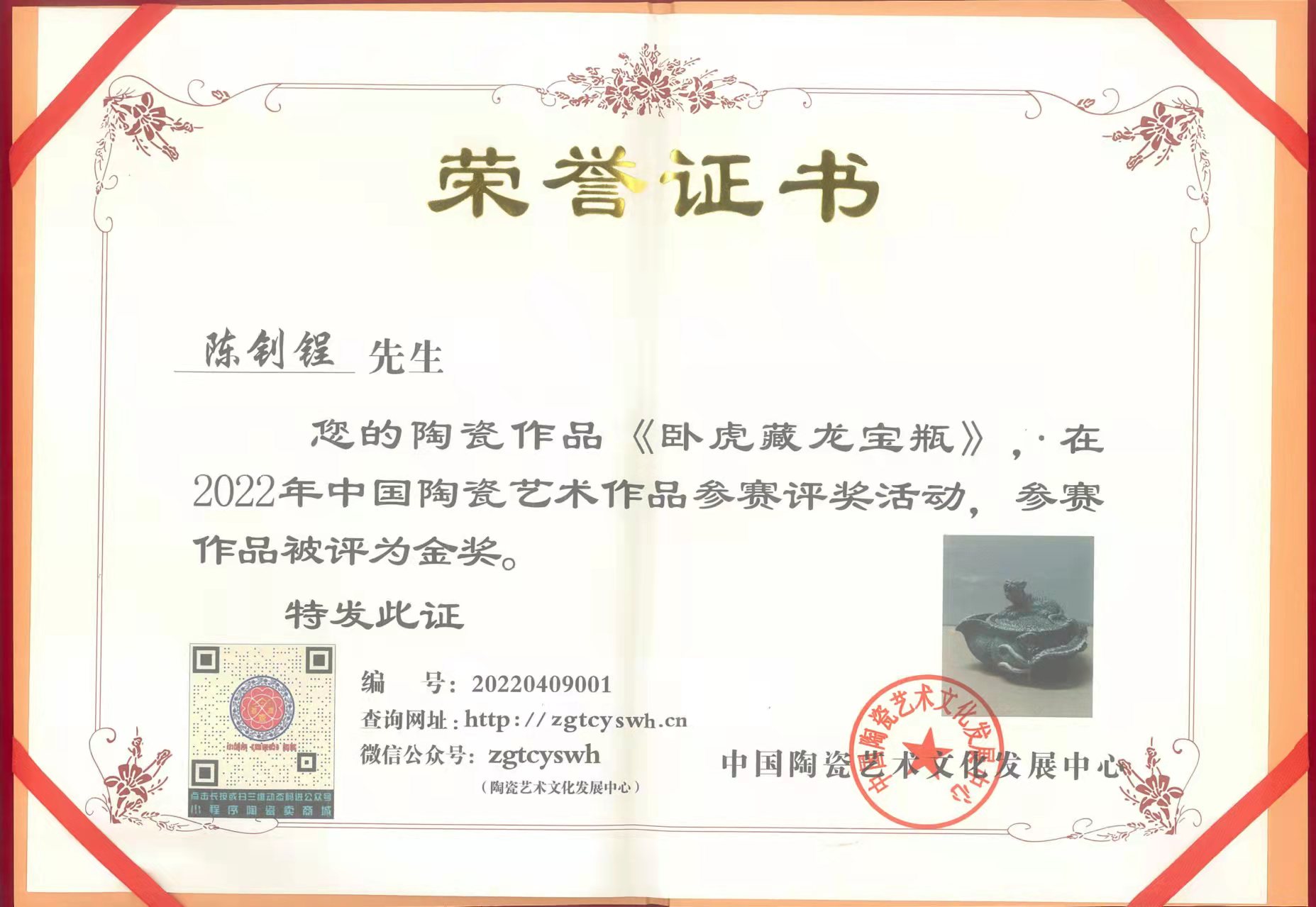 陈钊锃,中国陶瓷手工艺非遗传承人,中国陶瓷艺术文化发展中心会。其作品《卧虎藏龙宝瓶》荣获金奖,优秀创作仿,出生于世界陶瓷之都德化,毕业于泉州市职业工艺美术学校,福建省沐焰瓷庄陶瓷有限公司艺术总监。德化上千年的陶瓷文化,给予了瓷器以丰厚的滋养,巧夺天工的烧成技艺,精巧娴熟的手工制坯工艺,异彩纷呈的德化瓷雕艺术,陈钊锃着眼于当下的审美时尚,融入每一件器物独特的烧制变化中,赋予每一件器物以文化精神与艺术品格,使得每一件器物从定格的静态之美走向阡陌村廓,大漠炊烟的大千世界,瓷器,从此变得不一样,他突破了传统陶瓷的理性之美,将瓷器的审美升格为
