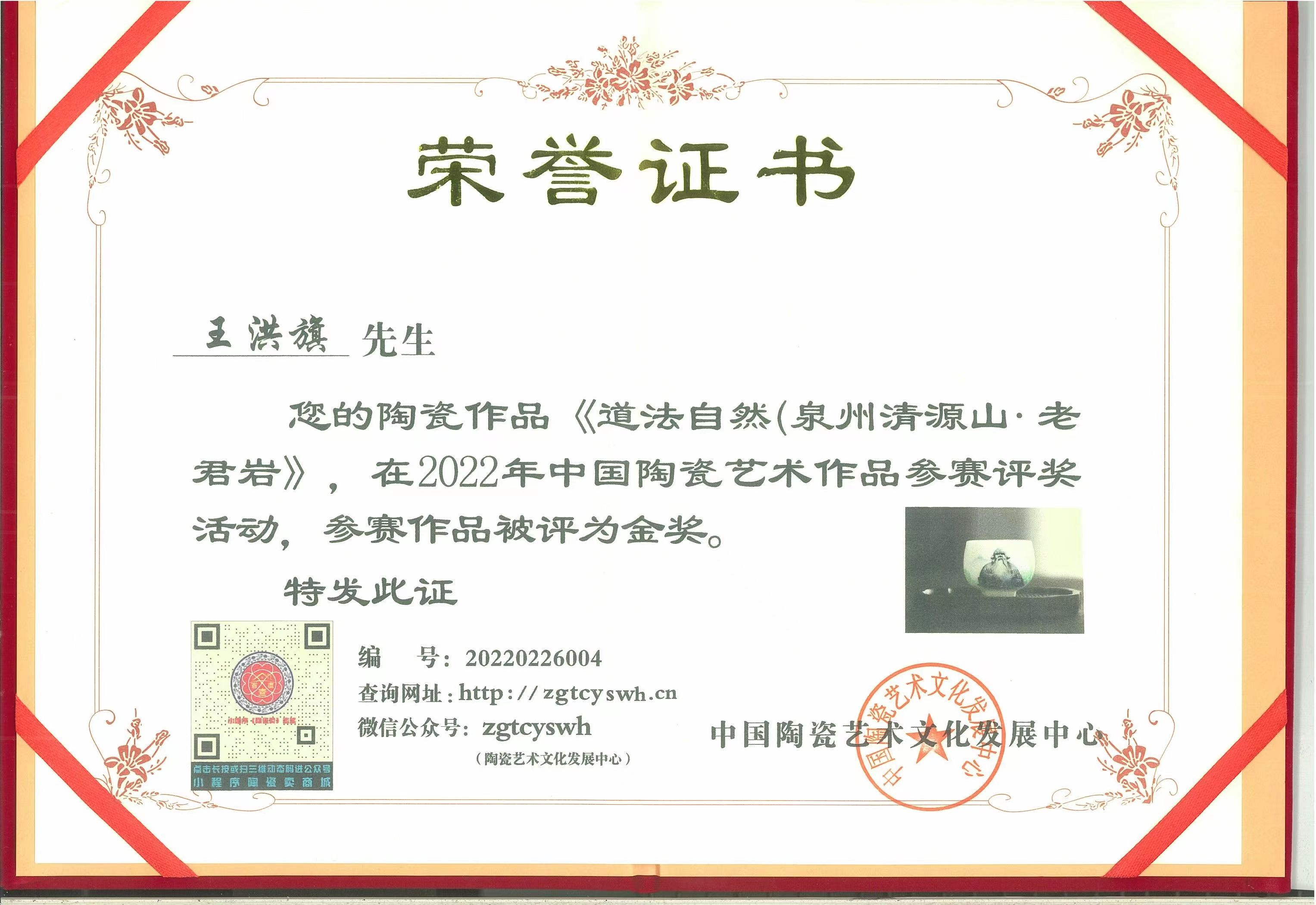作品《道法自然》(泉州清源山·老君岩)在2022年中国陶瓷艺术作品参赛评奖活动中获得 金奖