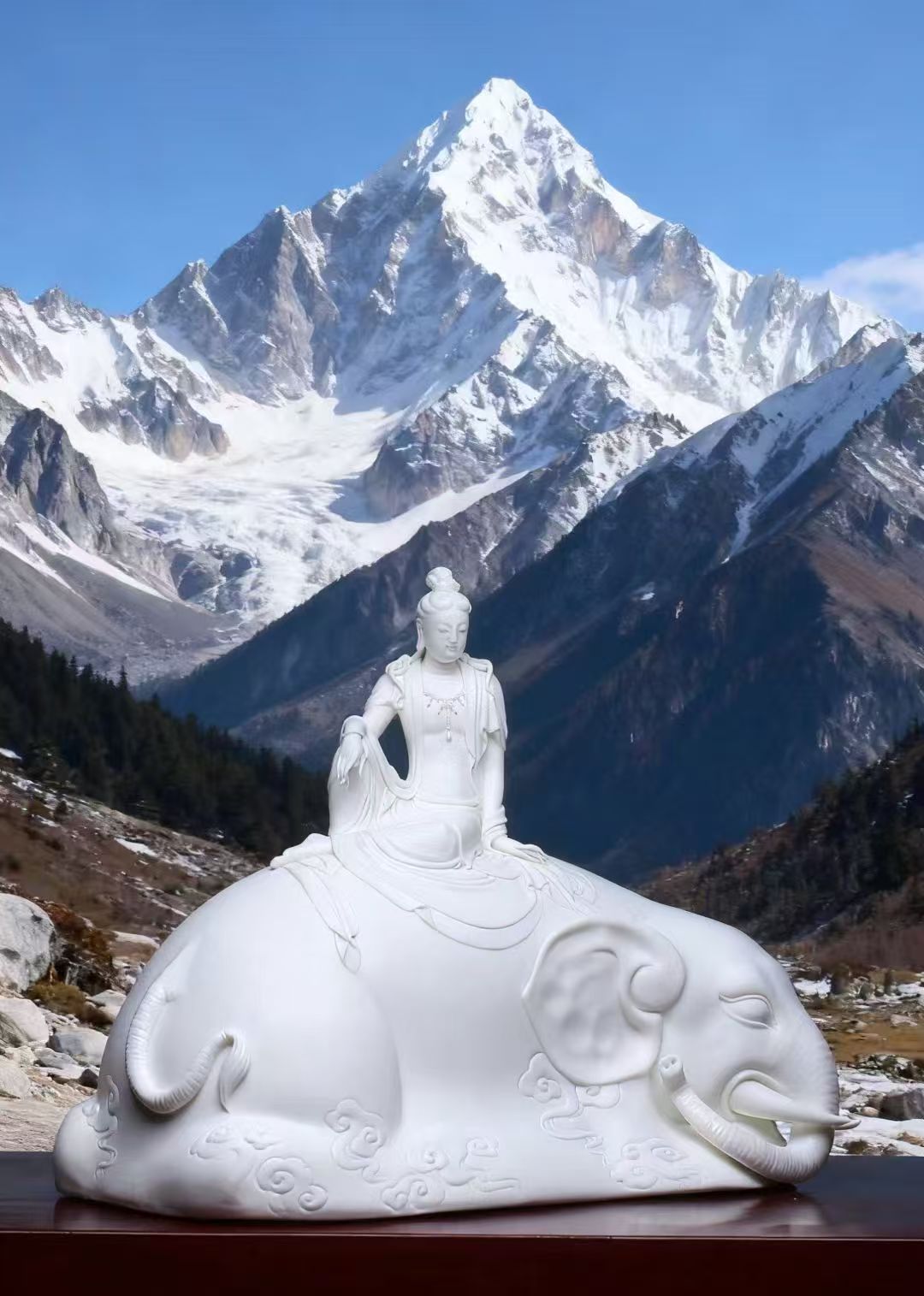 水月观音是三十三观音之一,由于此尊观音之形像,多与水中之月有关,故被称为水月观音,又称水吉祥观音,或水吉祥菩萨这是观世音一心观水相的应化身。作品《水月观音》是选用德化的高白瓷泥这一材质,以传统的自在观音造像为原形;用现代的表现形式加以塑造,面相端庄慈祥,气质高雅,头部用工具刻划出细致发丝,身前璎珞纹采用联珠装饰贴塑而成;观音的服饰有如瀑布水流,而圆月绞白无暇,运用大疏大密的雕塑语言加以表现。水月观音菩萨像的制作采用了刻划、贴塑、高温烧制等多种工艺相结合的手法,充分表现出瓷塑的特点。